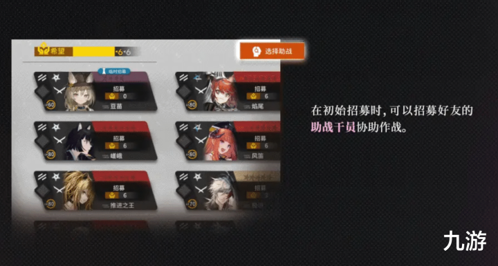 在初始招募时,可以招募好友的助战干员协助作战;还会出现随机的“临时招募”干员,这些干员的等级不受现有已拥有干员的影响,首次招募不消耗希望,在进阶后是最高等级;临时招募的情况下,还有机会遇到来自罗德岛的精英干员。