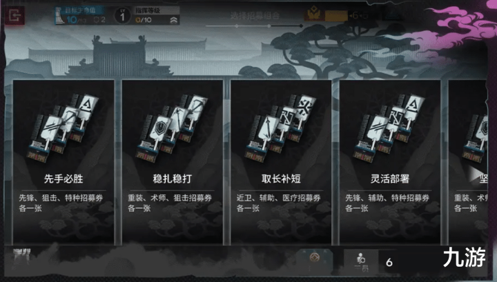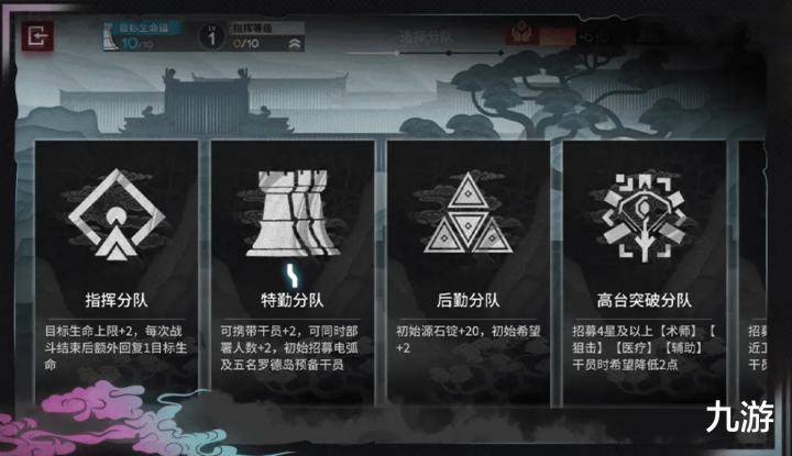 分队和招募:探险开始时,需要选择本次的探险分队,不同的分队会提供不同的战术效果,有丰富的小队种类可以选择,选择心仪的招募组进行初始招募,可决定本次跟随自己前往探险的第一批干员,探险过程中会有很多机会,可以获得不同职业的招募券,使用招募券可以自主扩充招募队伍,临时招募也是另一种选择。